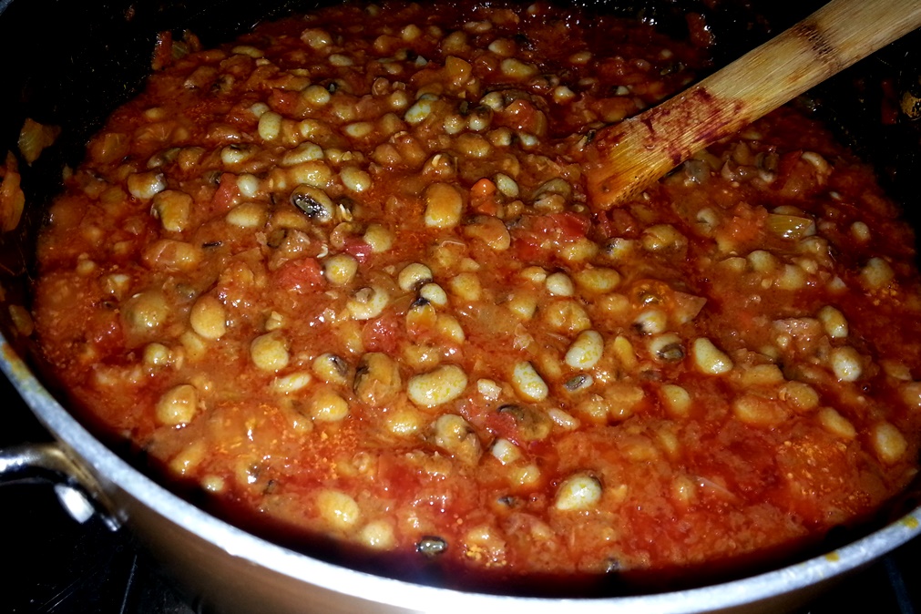 2. Add the palm oil and chopped onions in a pan, and boil for about 15 minutes. Add tomato paste and chopped chili, ginger and garlic, then chopped tomatoes, water, salt and a pinch of sugar. Let it boil for about 30 minutes, then add the drained beans. Bring to boil, and let it rest for about 15 minutes. Add more spices and salt to taste.