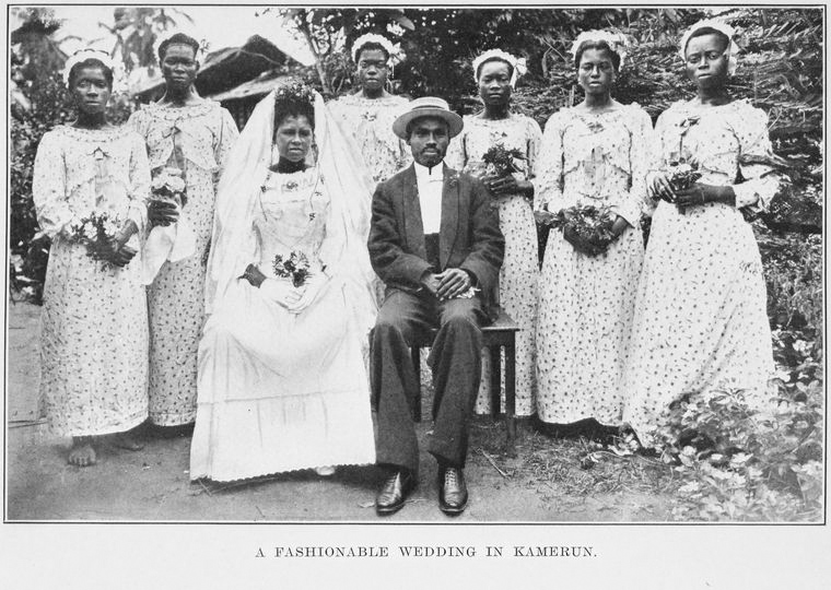 Während des Ersten Weltkriegs wurde die ehemalige deutsche Kolonie geteilt. 1922 erhielten Großbritannien und Frankreich das Land als Völkermandatsgebiet. Ein kleiner westlicher Teil des Landes wurde Nigeria zugeordnet. Nach dem Ende des Zweiten Weltkriegs begannen sich die afrikanischen Völker zu verbünden und gegen die Fremdherrschaft aufzulehnen. Es kam zu blutigen Aufständen. Der Widerstand wurde belohnt. Französisch-Kamerun erhielt 1958 eine eigene Verfassung. Erster Präsident des Landes wurde Ahmadou Ahidjo aus dem Volk der Fulbe. Im Januar 1960 wurde die Unabhängigkeit ausgerufen. Das Ereignis wurde groß gefeiert. Die Menschen tanzten auf den Straßen. Doch kurz darauf brach Streit aus zwischen den Völkern im Norden und im Süden Kameruns. Denn nicht alle Völker waren an der Regierung beteiligt. Die herrschende Regierung gründete eine Einheitspartei, um die Opposition zu unterdrücken. Auf dem Foto links siehst du eine Hochzeitsgesellschaft um 1912 in Jaunde. Links im Bild ist eine Hochzeitsgesellschaft um 1920.