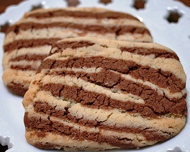 Den Backofen auf 200 Grad, Umluft 180 Grad, Gas Stufe 4 vorheizen. Teigblock in etwa 1/2 cm dicke Scheiben schneiden. Die Zebra-Plätzchen mit etwas Abstand auf mit Backpapier ausgelegte Backbleche legen.