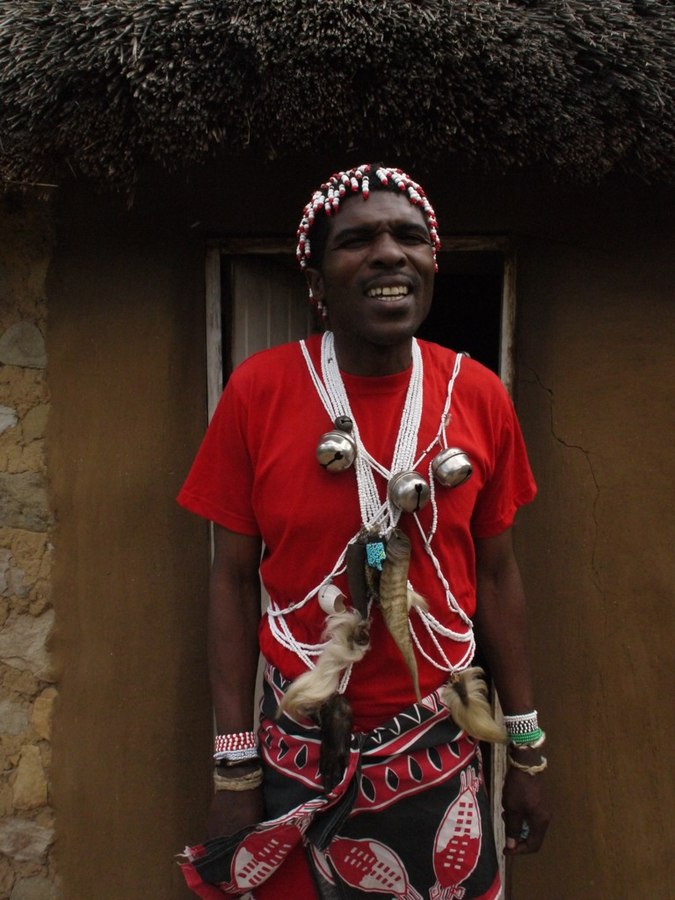 Im 19. Jahrhundert brachten die ersten französischen Missionare das Christentum nach Lesotho. Mit gehörigem Nachdruck versuchten sie den traditionellen Glauben zu verdrängen und die Bewohner zum Christentum zu bekehren. Sie gründeten die erste christliche Missionsstation des Landes. Über die Jahrhunderte vermengte sich das Christentum mit dem Ahnenglauben. Nach wie vor ist der Ahnenglaube für die Basotho sehr wichtig. Sie glauben, dass ihre Ahnen Einfluss auf ihr Leben haben und verehren die Vorfahren mit Riten und Opfergaben. Der Ahnenglaube spielt auch eine Rolle bei der Behandlung von Krankheiten. Deshalb hat jedes Dorf noch einen traditionellen Heiler, der bei allen Arten von Leiden aufgesucht wird. Auf dem Foto links siehst du einen Heiler, der die Mittel seiner Heilkunst um den Hals trägt wie Schellen, Gefäße mit Kräutern, Federn, Tierzähne und vieles mehr.