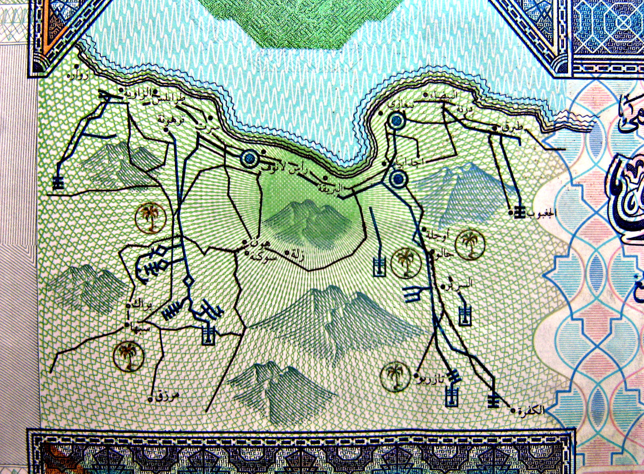 Die wichtigsten Reichtümer Libyens sind nicht die Ölquellen sondern Wasser. Das weltweit größte Reservoir fossilen Süßwassers liegt unter dem Boden seiner Wüsten. Ölfirmen fanden in der libyschen Wüste zufällig unterirdische Becken, die einen riesigen Wasservorrat enthielten. Es war fossiles Süßwasser, das Tausende von Jahren unterirdisch gespeichert war. Die Wasserreserven stammen aus der letzten Eiszeit. Aus vier unterirdischen Wüstenbecken– Sarir und Kufra im Südosten und Murzuq und Jabal Hasawanain im Südwesten - wird heute Wasser entnommen. Mittels eines riesigen Pipelinesystems wird das Wasser zu den großen Städten an der Mittelmeerküste gebracht. Libyens "Menschengemachter Fluss" transportiert fast 2,5 Million Kubikmeter Wasser täglich. Es fließt durch ein unterirdisches Netzwerk von Pipelines vom Nubischen Sandstein-Aquifer in der Großen Sahara zu den Städten an der Küste. Die Distanz reicht über 1.600 Kilometer. Damit wird 70 Prozent allen Süßwassers in Libyen beschafft. Auf dem Photo rechts siehst du das Pipeline System auf einer libyschen 20 Dinar Note.