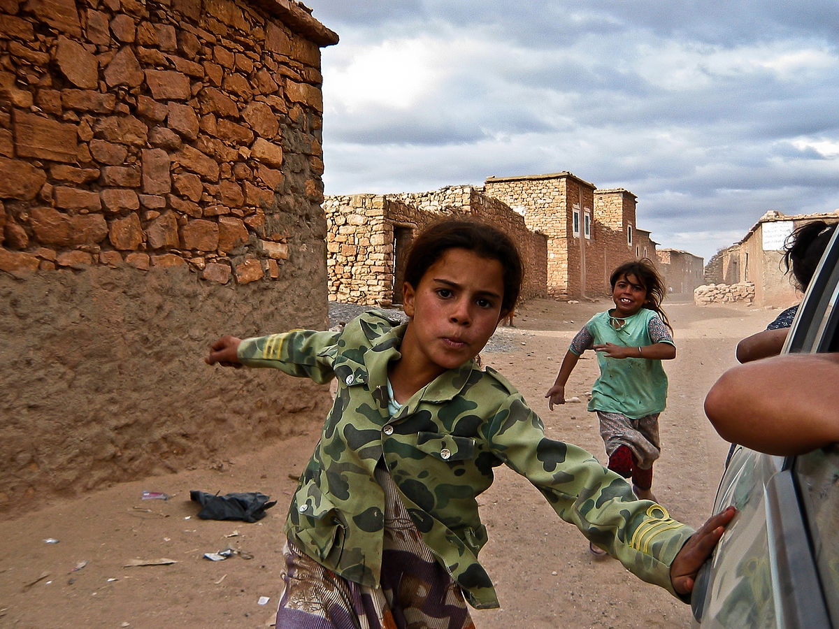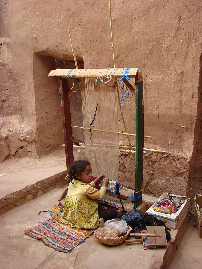 Die Bauernfamilien in Marokko betrachten es als selbstverständlich, dass ihre Kinder mithelfen. Daher ist Kinderarbeit in der Landwirtschaft üblich. Die Kinder hüten und versorgen die Ziegen und Schafe, sie helfen auf den Feldern und bei der Ernte. Auch im Kleingewerbe und in Handwerksbetrieben arbeiten Kinder schon früh mit. Mädchen etwa knüpfen Teppiche, helfen beim Stoffe färben oder in den Töpfereien. Kinder verrichten Hilfsdienste bei wohlhabenden Familien oder arbeiten in der Tourismusbranche. Ganz anders ist es bei Straßenkindern, die in den großen Städten zu finden sind. Etwa dreißig tausend Kinder leben auf der Straße. Sie arbeiten als Schuhputzer, helfen auf den Märkten oder verkaufen Touristen Taschentücher, Luftballons oder Blumen. Wenn es gut läuft, verdienen sie 20 bis 30 Dirham, das sind umgerechnet zwei bis drei Euro. Damit kann sich eine 5-köpfige Familie ein Essen leisten oder die halbe Tagesmiete einer billigen Unterkunft bezahlen. Einige Hilfsorganisationen kümmern sich um die Kinder und versorgen sie mit dem nötigsten, wie in vielen islamischen Ländern. Doch schlimm ist, dass die meisten keine Schule besuchen. Ohne Schulabschluss werden sie später keine gut bezahlte Arbeit finden und kaum der Armut entrinnen.