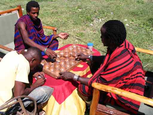 Wenn tansanische Kinder oder Erwachsene zusammensitzen, ist oft ein Holzbrett mit 32 Mulden im Spiel. Im wahrsten Sinne des Wortes, denn es handelt sich um das beliebteste Brettspiel Ostafrikas, genannt “Bao”. Bao ist ein Mancala-Spiel aus Afrika. Es wird in einigen Ländern Ostafrikas gespielt. In Malawi ist es auch unter dem Namen Bawo bekannt. Am populärsten ist es unter den Swahilis von Tansania und Kenia. Das Wort bao heißt ‚Brett‘ in Swahili. In unglaublicher Geschwindigkeit werden von den beiden Gegnern Samenkörner aus einer Mulde genommen und in andere verteilt. Die Spielzüge werden „säen“, „pflanzen“ und „essen“ genannt. Die komplexeste Variante heißt bezeichnenderweise “Bao der Swahilis”, denn an der Küste Tansanias und auf den Inseln wird es am häufigsten gespielt. Auf dem Foto rechts siehst du Massai beim Bao-Spiel.