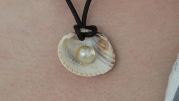 3. Nimm die Lederschnur doppelt, so dass eine Schlaufe entsteht. Diese Schlaufe ziehst du durch das Loch in der Muschel. Nun musst du nur noch die beiden Enden der Schnur durch die Schlaufe stecken und fest ziehen. Fertig ist die Muschelkette!