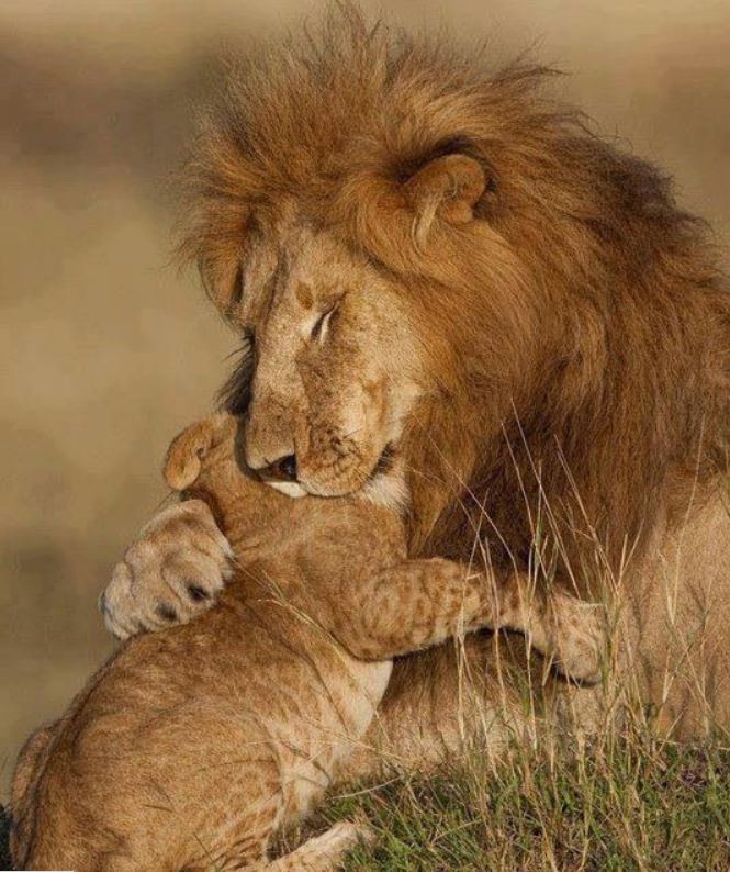 Löwenbabys sind Winzlinge, wenn sie auf die Welt kommen, sie messen etwa 40 bis 55 Zentimeter. Ihr Fell ist gefleckt, doch die Flecken verschwinden, wenn sie größer werden. Anfangs sind sie mit der Löwenmutter alleine. Erst nach ein paar Wochen werden sie von ihrer Mama dem übrigen Rudel vorgestellt. Die anderen Löwinnen des Rudels kümmern sich um die Jungen von Anfang an mit und säugen sie auch, wenn sie gerade selbst Junge haben. Wenn die Kleinen sechs Monate alt sind, werden sie entwöhnt. Dann dürfen sie auch zum ersten Mal mit auf die Jagd. Doch es dauert, bis sie alle Tricks gelernt haben wie zum Beispiel leises Anschleichen. Auch ihr furchterregendes Gebrüll müssen sie erst üben. Die Löwenväter sind stolz auf ihren Nachwuchs, manchmal spielen sie mit den Kleinen, aber meist wollen sie vom Nachwuchs nicht belästigt werden. Dieser Löwenvater auf dem Foto links ist eine Ausnahme. Erwachsene Löwenmännchen schmusen kaum mit ihren Kindern.